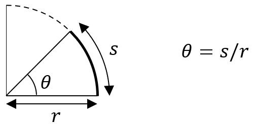 So what if we want to do more exotic things with physical quantities, like exponentiation or putting them into a cosine function? As a general rule, anything more complicated than addition, multiplication, or (sometimes) roots requires dimensionless quantities. Let’s take cosine as an example. Normally, we put an angle into a trigonometric function like cosine, so you might think that something with dimensions of angle can go into cosine. That is because angles actually don’t have dimension! You can see this from the definition of angles in radians, which is given by the length of the arc of a circle subtended by the angle divided by the radius of the circle. As a ratio of lengths, angles must then have no dimension.